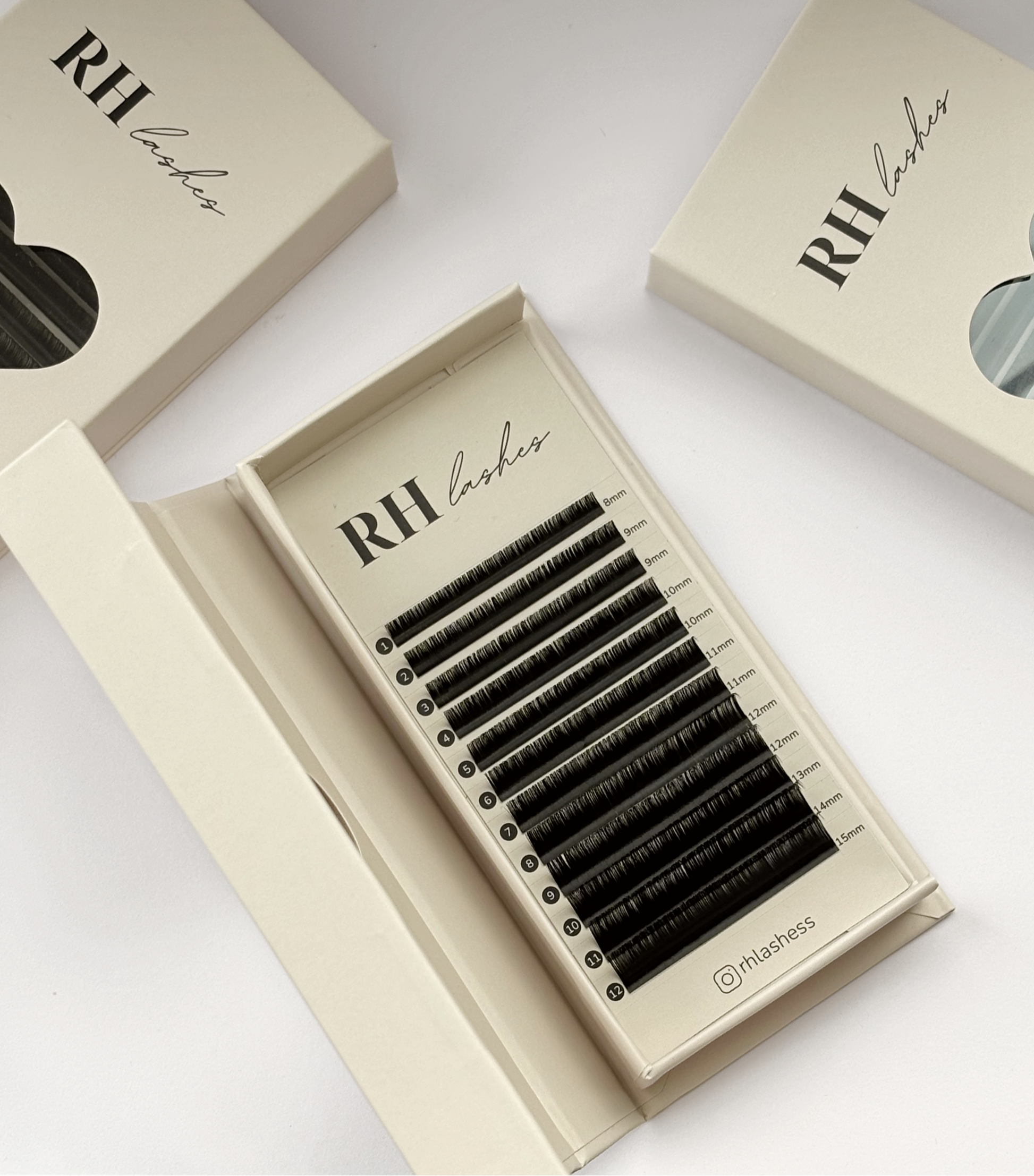 Each tray contains 12 rows of one chosen length (8–16mm), making them ideal for lash artists who prefer working with a consistent length for their sets. Perfectly suited for Russian Volume fanning techniques, these lashes are also available in a variety of curls to complement any desired style.